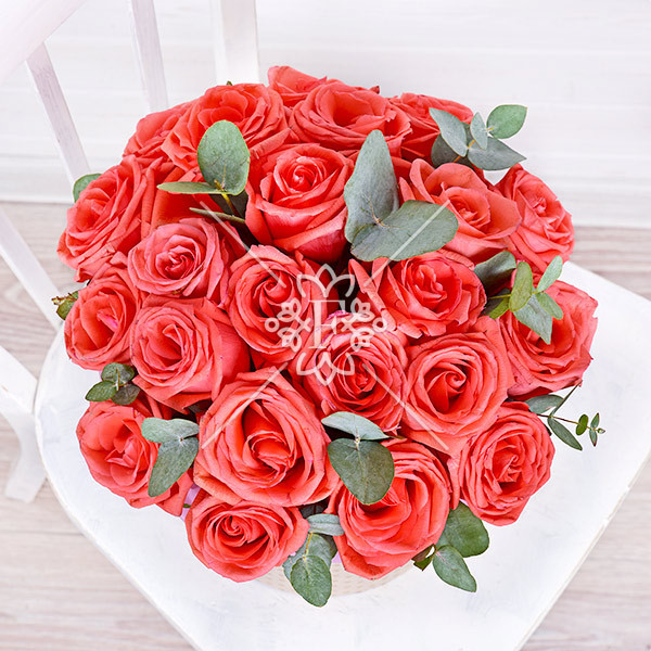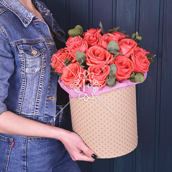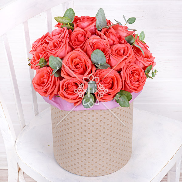 Изумительные розы кораллового цвета в сочетании с благородной зеленью эвкалипта уютно разместились в прекрасной шляпной коробке!  Вся композиция выглядит очень гармонично и долгое время будет радовать дорогого для Вас человека !